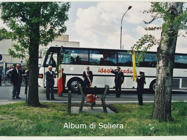 CINQUANTANOVESIMA COMMEMORAZIONE DEL 25 APRILE, FESTA DELLA LIBERAZIONE, DEPOSIZIONE DEI FIORI AL CIPPO DI STRADELLO MORELLO DEDICATO AD ELVIRA VEZZALI, PERSONE DAVANTI ALLA LAPIDE, UOMO IN VECE DI SINDACO CON FASCIA TRICOLORE, IL MARESCIALLO VINCENZO MASSIMI, VIGILE CON GONFALONE COMUNALE, UOMO CON BANDIERA TRICOLORE DELL'A.N.P.I. (ASSOCIAZIONE NAZIONALE PARTIGIANI D'ITALIA), PULLMAN FERMO SULLA STRADA, ALBERI