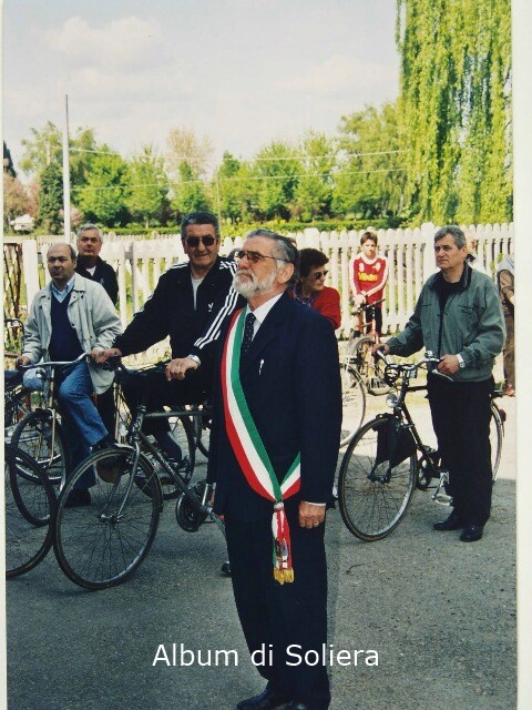 CINQUANTANOVESIMA COMMEMORAZIONE DEL 25 APRILE, FESTA DELLA LIBERAZIONE, DEPOSIZIONE DEI FIORI AL CIPPO DI VIA I° MAGGIO (GIA' VIA ROMA) IN MEMORIA DI REMO FORNACIARI, UOMO CON FASCIA TRICOLORE IN VECE DI SINDACO, PERSONE IN BICICLETTA