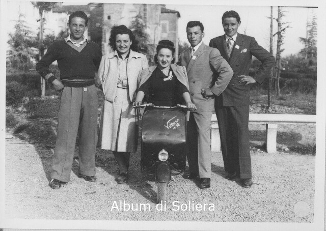 ATTUALE PIAZZA LUSVARDI, GRUPPO DI UOMINI E DONNE (UNA SU MOTORINO "VILLIERS CC 98"), A FIGURA INTERA. SULLO SFONDO, CASTELLO CAMPORI. SI RICONOSCONO: DOMENICO SGARBI, GUIDO MAZZONI, GINNA MENNARI, ANGIOLINA GASPARINI, GIUSEPPE GENNARI)