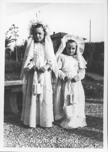 BAMBINE A FIGURA INTERA CON ABITI BIANCHI E VELI DA CRESIMA O COMUNIONE, BORSETTE.