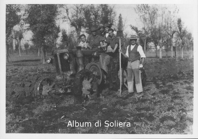 CASA MANFREDINI, GRUPPO DI UOMINI (CONTADINI) SU TRATTORE "LANDINI", UNO CON BADILE, IN OCCASIONE DELL'OPERAZIONE DI ARATURA