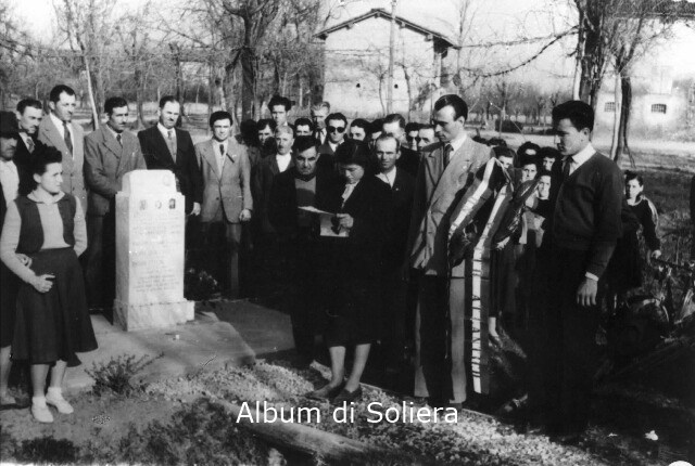 CERIMONIA DI INAUGURAZIONE DEI CIPPI E DELLE LAPIDI A RICORDO DEI CADUTI, PARTIGIANI. UNA DONNA LEGGE IL DISCORSO, FOLLA DI UOMINI, DONNE E BAMBINI.