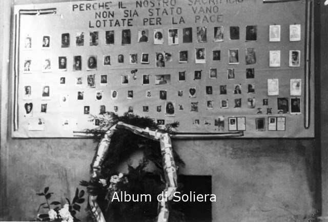 CERIMONIA DI INAUGURAZIONE DEI CIPPI E DELLE LAPIDI A RICORDO DEI PARTIGIANI. PANNELLO CON LE FOTO DEI PARTIGIANI E CORONA D'ALLORO