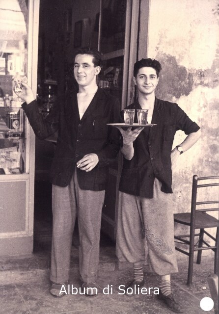 COPPIA DI GIOVANI UOMINI (RAGAZZI) IN POSA DAVANTI ENTRATA DI BAR, SEDIA, VASSOIO CON BICCHIERI. SI RICONOSCE IL BARISTA AMEDEO MESSEROTTI