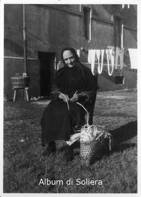 DONNA ANZIANA IN ESTERNO SEDUTA SU SEDIA DAVANTI ABITAZIONE INTRECCIA PAGLIA, MASTELLO PER LAVARE I PANNI, PANNI STESI