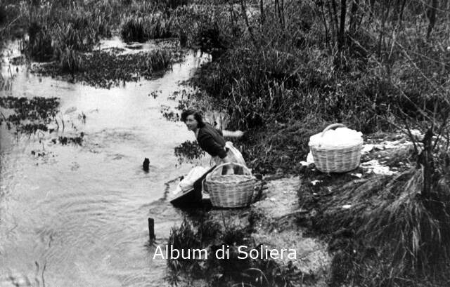 DONNA IN RIVA AD UN CORSO D'ACQUA MENTRE LAVA PANNI, CESTI CONTENENTI BIANCHERIA
