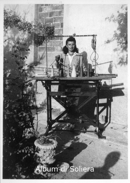 DONNA (ZITA POPPI), LAVORANTE A DOMICILIO DIETRO MACCHINA PER LA PRODUZIONE DI TELI PER MAGLIERIA, FIORIERA