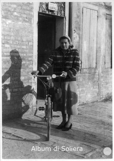 DORINA PO, LEVATRICE, APPOGGIATA A BICICLETTA DAVANTI PORTA ESTERNA CON TARGA CON SCRITTA "DORINA PO LEVATRICE"