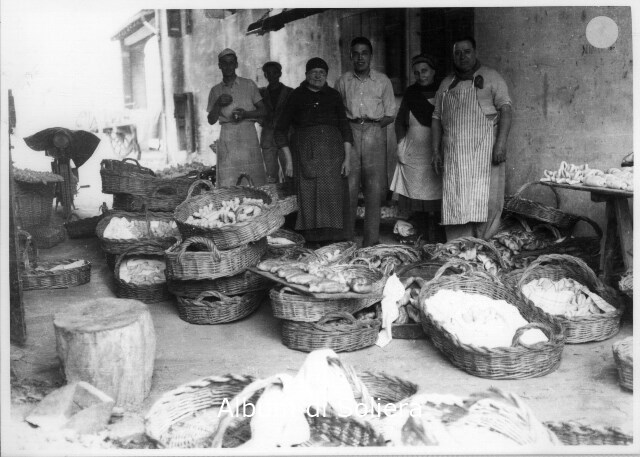 ESTERNO DEL FORNO DI ZELINDO NEVALI (PRIMO A DESTRA) CON GARZONI E CLIENTI. CESTE DI GIUNCO CON PANE FATTO IN CASA DA CUOCERE E COTTO NEL FORNO