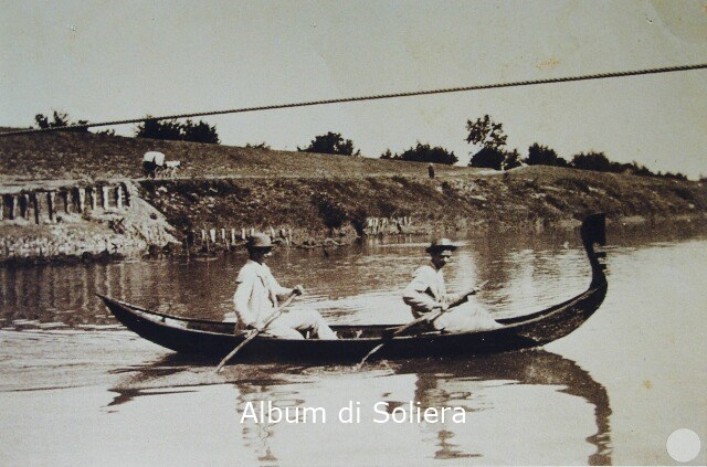 FIUME SECCHIA, DUE UOMINI IN BARCA DURANTE IL PASSAGGIO DA UNA RIVA ALL'ALTRA, ARGINE DEL FIUME, CALESSE, ALBERI