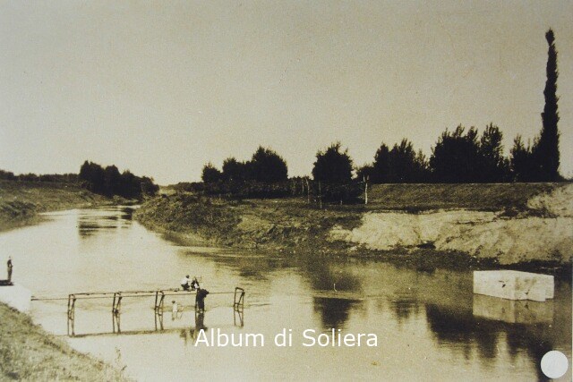 FIUME SECCHIA, INNALZAMENTO DELLA TRAVERSA NEL SOLIERESE, OPERAI AL LAVORO SU UN'IMPALCATURA NEL MEZZO DEL FIUME, ARGINI, ALBERI