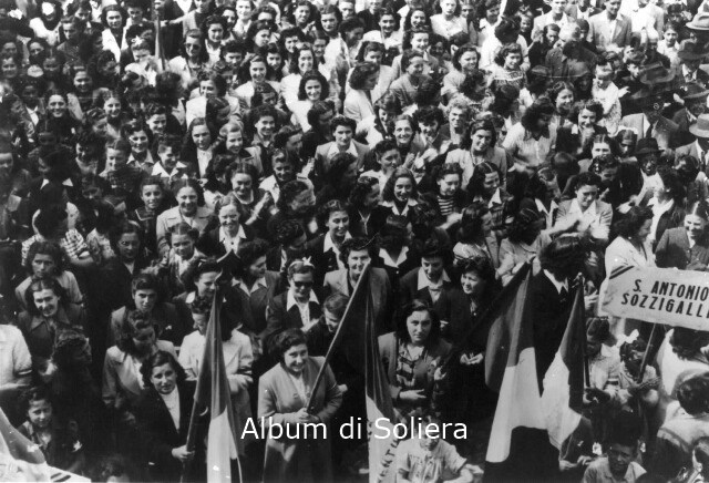FOLLA DI DONNE, STAFFETTE PARTIGIANE CON BANDIERE FESTEGGIANO LA LIBERAZIONE, CARTELLO CON SCRITTO: S.ANTONIO SOZZIGALLI