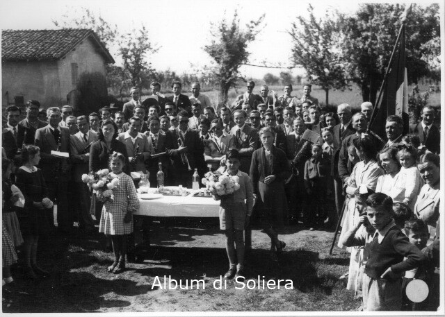 GRUPPO A FIGURA INTERA (UOMINI, DONNE, BAMBINI CON MAZZI DI FIORI), TAVOLO APPARECCHIATO, ALBERI, CASA. BANDA MUSICALE CON AL CENTRO IL MAESTRO BRUNO LUGLI. DA SINISTRA LA BANDA E' COMPOSTA DA: (MUSICISTI NON IDENTIFICATI), CARLO PREVIDI, CINO ROSI, REMO LUGLI, TACITO MARCHESI, PIETRO RAIMONDI, AVERTANO GUALDI, RINO ANDREOLI, GIOVANNI VARNI.