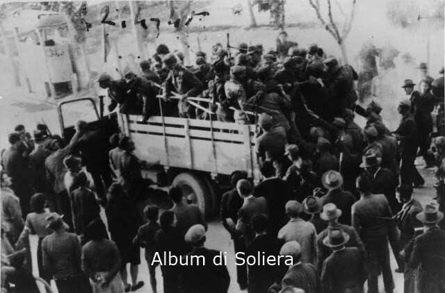 GRUPPO DI UOMINI IN DIVISA, MILITARI (PRIGIONIERI) SISTEMANTI SU UN AUTOCARRO, UOMINI E DONNE, FOLLA RACCOLTA PER LA LIBERAZIONE