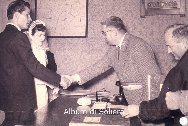 MATRIMONIO CIVILE, COPPIA DI SPOSI (NUNZIO MONTI E SIGNORA), SINDACO CELEBRANTE ALBERTO RONCAGLIA, MARIO BENASSI UFFICIALE DI STATO CIVILE, SCRIVANIA, CARTA GEOGRAFICA