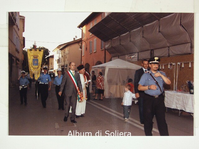 PIAZZA FRATELLI SASSI, UOMINI E DONNE, IL SINDACO CON FASCIA TRICOLORE DAVIDE BARUFFI DURANTE L'INAUGURAZIONE DELLA CENTOCINQUANTATREESIMA FIERA DI SOLIERA, VIGILI URBANI IN UNIFORME, PRETE, PARROCO DON ANTONIO MANFREDINI