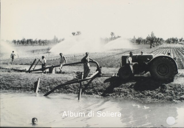 UOMINI CON POMPA CHE ASPIRA L'ACQUA DA UN FIUME TRAMITE DEI TUBI PER L'IRRIGAZIONE DEI CAMPI, TRATTORE