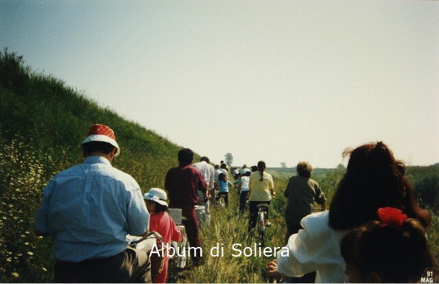 UOMINI, DONNE E BAMBINI IN BICICLETTA IN CAMPAGNA IN OCCASIONE DELLA GIORNATA DELLA BICICLETTA, ALBERI, CAMPI, ARGINE DEL FIUME SECCHIA
