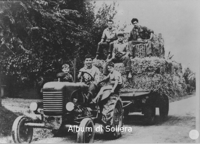 UOMINI E BAMBINI SU TRATTORE CHE TRAINA UN CARRO CARICO DI COVONI DI FIENO E PAGLIA RACCOLTI PER IL P.C.I.