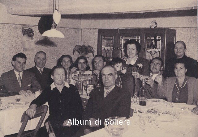 UOMINI E DONNE (ALCUNI CHE BRINDANO) SEDUTI AD UN TAVOLO APPARECCHIATO, LAMPADARIO, SVEGLIA, GUFO IMPAGLIATO, CREDENZA, BICCHIERI, CARAFFA, BOTTIGLIA