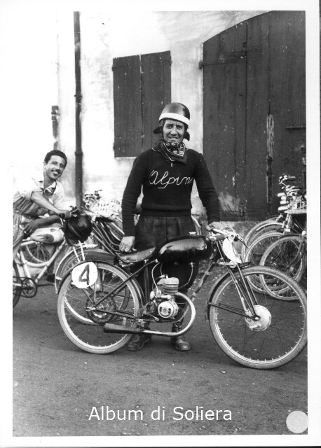 UOMINI SU MOTOCILETTA, AL CENTRO CON MAGLIA ALPINO SI TROVA GUIDO SETTI