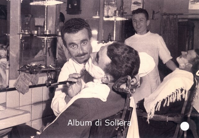 UOMO (BARBIERE GUALDI) RADE LA BARBA AD UN CLIENTE (VACCARI AUGUSTO), IN SECONDO PIANO GARZONE CON CLIENTE SEDUTO SU POLTRONA CON POGGIATESTA, RASOIO, FORBICI, ASCIUGAMANO