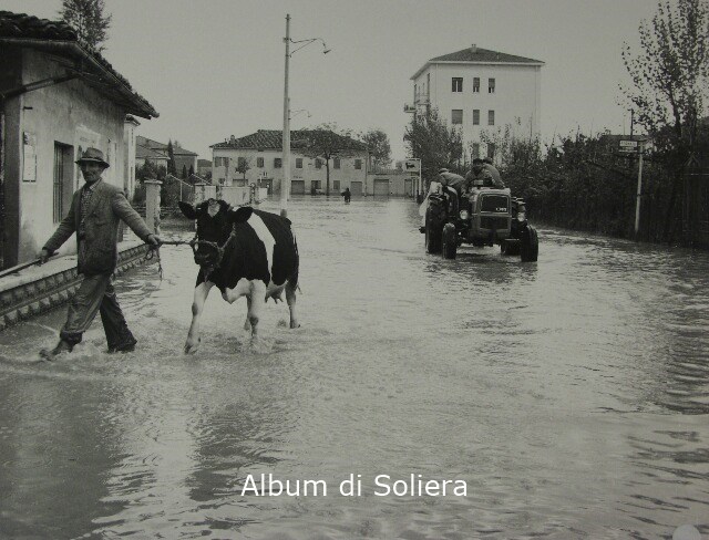 VIA ROMA, ALLUVIONE, GRUPPO DI UOMINI SU UN TRATTORE, UOMO (Gioacchino Leonardi) MENTRE METTE AL RIPARO UNA MUCCA, CASE, ALBERI