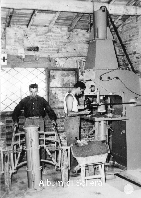 VIA ROMA, SGARBI DOMENICO E SCHIAVO QUINTO DELLA DITTA SGARBI LAVORANO ALLA MACCHINA PER LA PRODUZIONE DI MANUFATTI EDILI (TUBI IN CALCESTRUZZO), CARIOLA