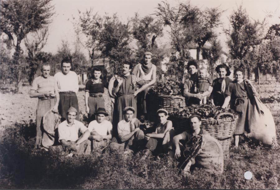VIA MARTIRI PARTIGIANI, GRUPPO DI DONNE INTRECCIANO PAGLIA PER LA PRODUZIONE DI CAPPELLI PER LA DITTA MENOTTI GIUSEPPE DI CARPI. SI RICONOSCONO DA SINISTRA: PIA, GIANNINA, ROMA GASPARINI, CONCETTA ARLETTI, DORA, ELVIRA SABBADINI